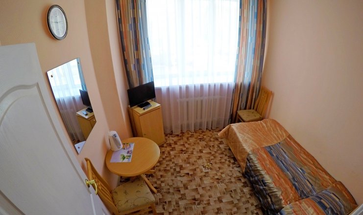В номере: журнальный столик, 2 стула, шкаф, телевизор, холодильник, электрочайник, фен, односпальная кровать.