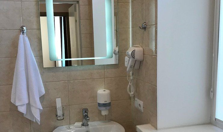 Санузел: душевая кабина, раковина, унитаз, фен, гигиенические принадлежности, тапочки