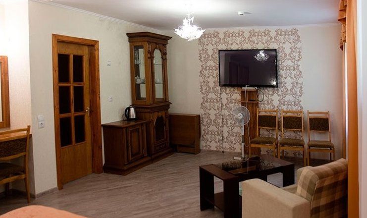 В номере: кровать двуспальная, прикроватные тумбочки, шкаф, мягкая мебель, телевизор, холодильник, чайный набор посуды