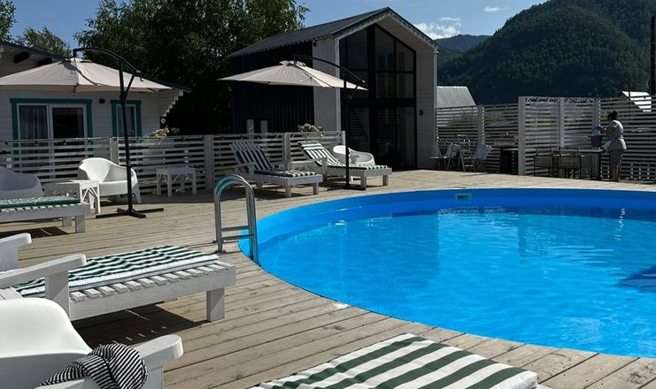 • с шезлонгами и зонтиками, вода  пресная, подогреваемый, пользование бассейном входит в стоимость, работает сезонно
