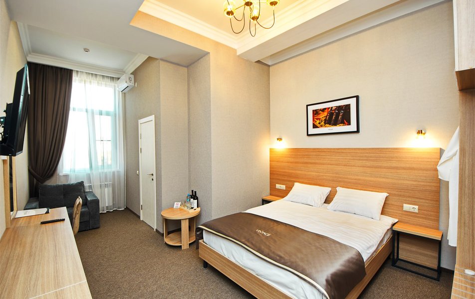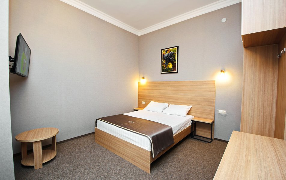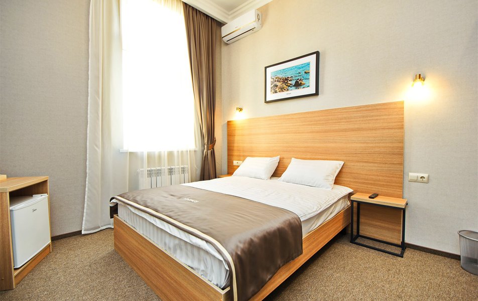 В номере: вешалка,  зеркало, кровать двуспальная, кресло-кровать, прикроватные тумбочки, стол, стулья, шкаф, мини-холодильник, набор посуды, сплит-система, телевизор